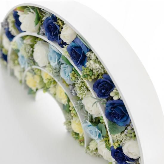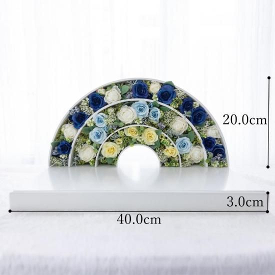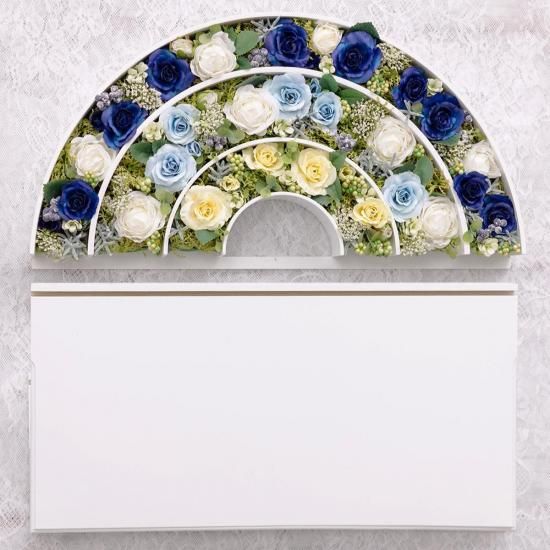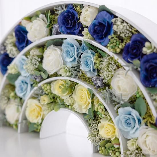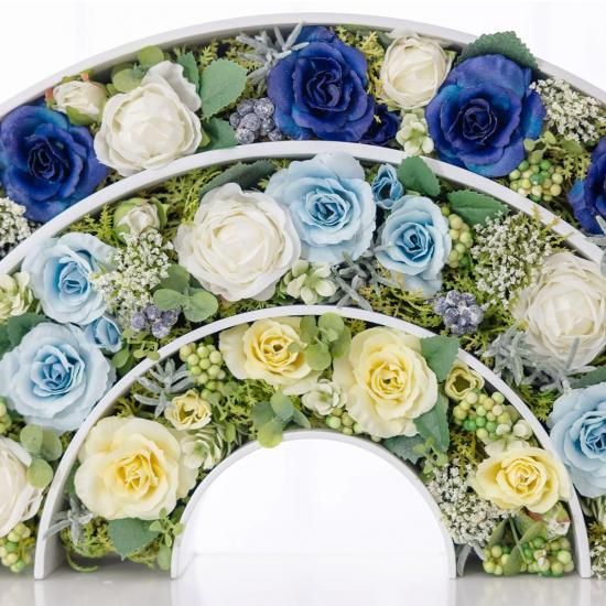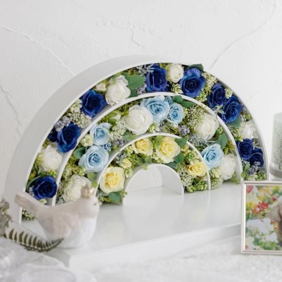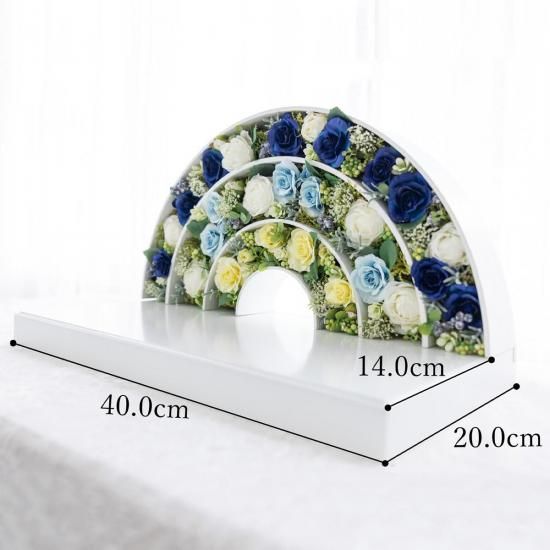 仏花は静岡県のフラワーデザイナーさんによって1つ1つ手作りで製作しています。虹のグラデーションを美しく表現するため、色彩の異なるお花を3層に散りばめました。花材は厳選された高品質のアーティフィシャルフラワー(造花)のみ使用しています。使用している花材やグリーン等の副材は合計で約27種類に及び、繊細な表情を生み出しています。